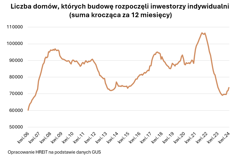 Studząc huraoptymizm należy jednak dodać, że mówimy póki co tylko o trzech konsekwentnych pozytywnych odczytach, a ponadto startujemy tu z bardzo niskiego poziomu. Jeszcze w styczniu br. aktywność w sektorze budownictwa indywidualnego była wręcz rachityczna. Sumując rozpoczęte budowy z okresu 12 miesięcy otrzymaliśmy wtedy wyniki na poziomie poniżej 70 tysięcy domów. To był jeden z najsłabszych odczytów na temat budowy domów jednorodzinnych od 17 lat. Dopiero od trzech miesięcy dane GUS zaczynają sugerować, że od tak wyznaczonego dna zaczynamy się odbijać.