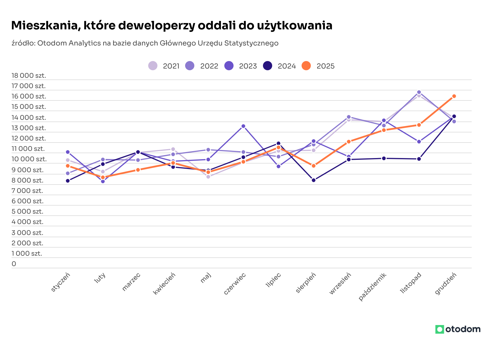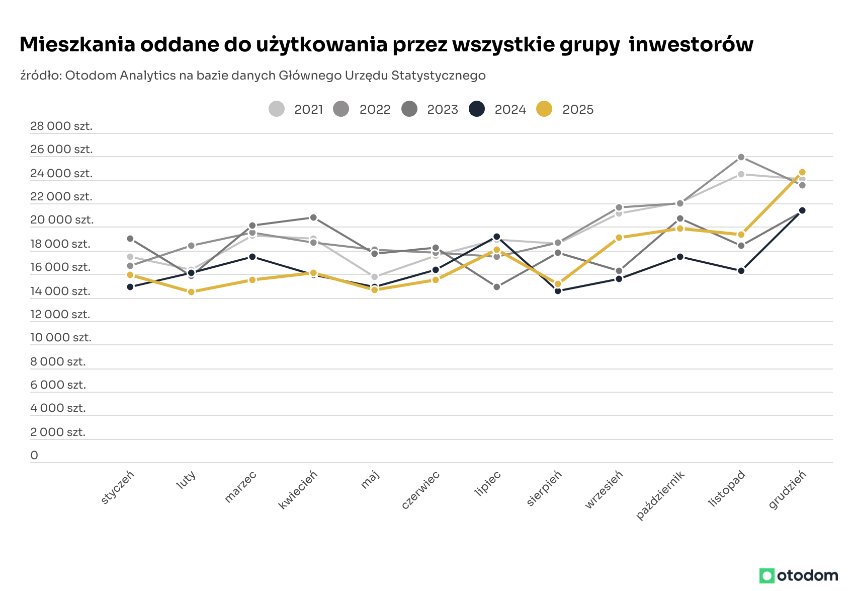 Grudniowe dane Głównego Urzędu Statystycznego (GUS) dotyczące skali nowego budownictwa mieszkaniowego w Polsce wskazują, że mieliśmy do czynienia z wyjątkowym miesiącem na tym rynku. W każdej kategorii rejestrowanej przez GUS (mieszkania oddane, pozwolenia na budowę, rozpoczęte budowy) zagregowane dla wszystkich grup inwestorów wyniki okazały się lepsze niż w listopadzie, a także w stosunku do grudnia 2024 roku. Liczba mieszkań oddanych do użytku w grudniu jest o 15% wyższa niż przed rokiem, pozwoleń na budowę było o 20% więcej, a rozpoczętych budów o 4% więcej niż przed rokiem.