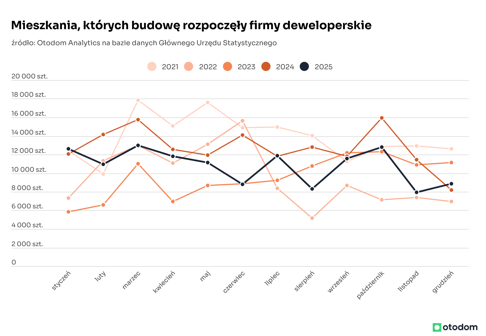 Statystyki GUS z poszczególnych miesięcy 2025 roku dotyczące rozpoczynanych w całej Polsce budów wskazywały, że od kwietnia skala nowych inwestycji słabła. Nadzieją na odwrócenie tej tendencji były dane GUS z lipca, kiedy nastąpił wyraźny wzrost w ujęciu miesiąc do miesiąca i wyrównanie wyników sprzed roku. Podobnie wyglądał wrzesień i październik za sprawą wyższej aktywności firm deweloperskich. Listopadowe dane zmroziły nadzieje o ożywieniu w budownictwie mieszkaniowym, a grudniowe tylko delikatnie je poprawiły. Liczba budów rozpoczętych w grudniu przez wszystkie grupy inwestorów była nieznacznie wyższa niż w listopadzie (0,6%) i delikatnie wyższa niż w analogicznym okresie 2024 roku (4,1%).