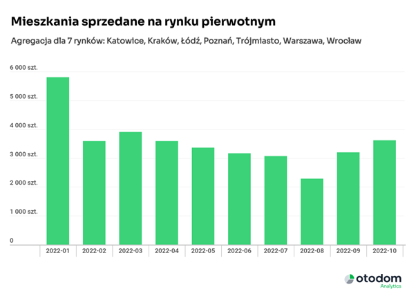 Październik 2022 był relatywnie dobrym miesiącem, jeśli chodzi o sprzedaż mieszkań na rynku pierwotnym. Z danych Otodom Analytics wynika, że na każdym z siedmiu najważniejszych rynków deweloperzy sprzedali więcej lokali niż we wrześniu, największą poprawę zanotowano w Poznaniu, gdzie wzrost przekroczył 20%. To drugi miesiąc z rzędu wzrostów sprzedaży, wrzesień także był lepszy od sierpnia.