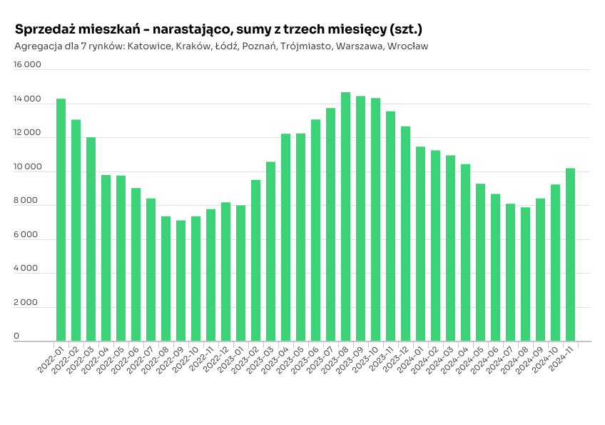 „Źródłem poprawy tego wskaźnika była nie tylko relatywnie dobra listopadowa sprzedaż, ale przede wszystkim zagregowany trzymiesięczny wolumen transakcji, który przekroczył 10 tys. sprzedanych mieszkań. Porównywalny skumulowany wynik sprzedaży odnotowaliśmy w Otodom Analytics w kwietniu 2024 roku – ostatnim miesiącu, w którym na rynek mieszkaniowy oddziaływał Bezpieczny Kredyt 2%, tj. banki udzielały ostatnich kredytów”, wyjaśnia Katarzyna Kuniewicz, dyrektorka badań w Otodom Analytics.