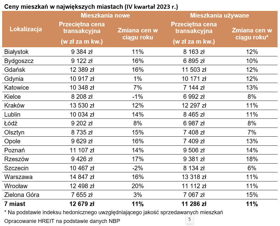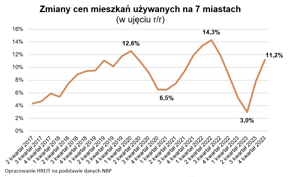W czwartym kwartale 2023 roku za mieszkania w największych miastach płaciliśmy o 11,2% więcej niż w analogicznym okresie przed rokiem – wynika z najnowszych danych NBP na temat zmian cen mieszkań na rynku wtórnym (indeks hedoniczny dla 7 miast). Plusem jest to, że dynamika wzrostów cen okazała się znacznie mniejsza niż ta, którą sugerowały ceny z portali ogłoszeniowych. Z drugiej strony najnowsze podsumowanie przygotowane przez bank centralny sugeruje, że w 14 na 17 przebadanych miast ceny mieszkań były najwyższe w historii.