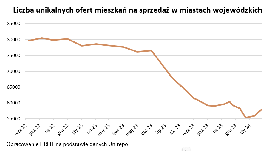 A gdyby i tego było mało, to nie możemy zapominać o tym jak bardzo w ostatnim czasie wyprzedała się oferta mieszkań. Szczególnie wyraźnie widać to było pod koniec 2023 roku. Wtedy można było wybierać z oferty prawie o 1/3 mniejszej niż rok wcześniej. Nie jest tajemnicą, że wyprzedały się przede wszystkim mieszkania tańsze. To tym bardziej w sposób „sztuczny” zawyżało przeciętną cenę ofertową. Skoro bowiem w ofercie brakuje mieszkań tanich, a są w niej lokale drogie, to podnosi to średnią stawkę. Ostatnie tygodnie dają jednak nadzieję na poprawę tej sytuacji i choć wciąż w ofercie zalega sporo mieszkań wycenionych nieracjonalnie, to podaż się odbudowuje. Jeśli zmiana ta będzie kontynuowana, to coraz łatwiej będzie znaleźć mieszkanie o akceptowalnej cenie.