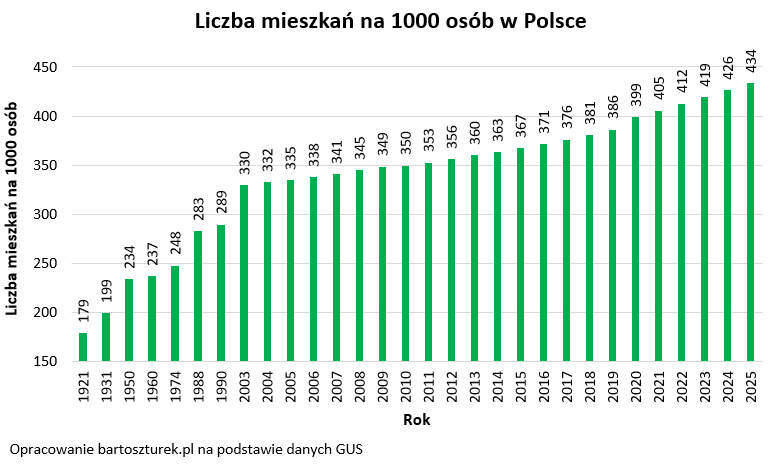 Nie tylko jednak mieszkań w Polsce przybywa, ale z drugiej strony mniej się nas rodzi niż umiera (na koniec 2025 roku liczbę ludności Polski można szacować na niewiele ponad 37,3 mln). Tym szybciej rośnie więc liczba mieszkań przypadająca na tysiąc osób.