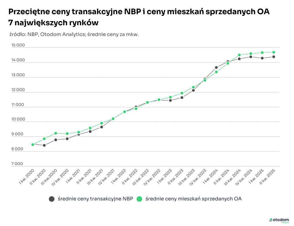 Dane Narodowego Banku Polskiego wskazują, że w ciągu pięciu lat w siedmiu głównych miastach w Polsce (Warszawa, Łódź, Kraków, Wrocław, Poznań, Gdańsk, Gdynia) ceny transakcyjne na rynku deweloperskim wzrosły aż o 71%. Z kolei według analiz Otodom trend wzrostowy nadal się utrzymuje i nic nie wskazuje na to, by III kwartał 2025 roku miał przynieść wyhamowanie. Wręcz przeciwnie, stawki transakcyjne wciąż pozostają na ścieżce wzrostu.