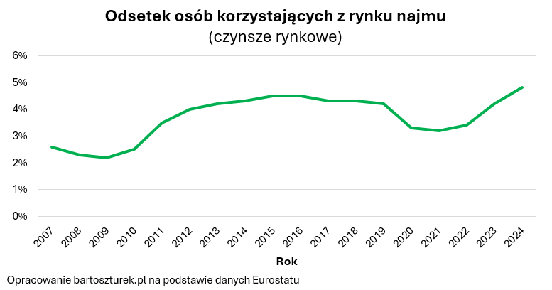 Przyjmując więc zachowawczo, że w przeciętnym wynajmowanym lokum mieszkają 3-4 osoby, to otrzymujemy informację z której wynika, że wg statystyk Eurostatu w Polsce wynajmowanych może być tylko około 450-600 tysięcy domów i mieszkań. Nijak ma się to do rzeczywistości. Nawet Minister Finansów podsumowując 2023 rok ogłosił przecież, że ryczałt od prywatnego najmu zapłaciło mu ponad 1,1 mln podatników. Oczywiście ryczałt od prywatnego najmu należy też płacić od wynajmu innych rzeczy, a nie tylko nieruchomości, ale jasnym jest, że głównie płacą go podatnicy zarabiający na wynajmie mieszkań.