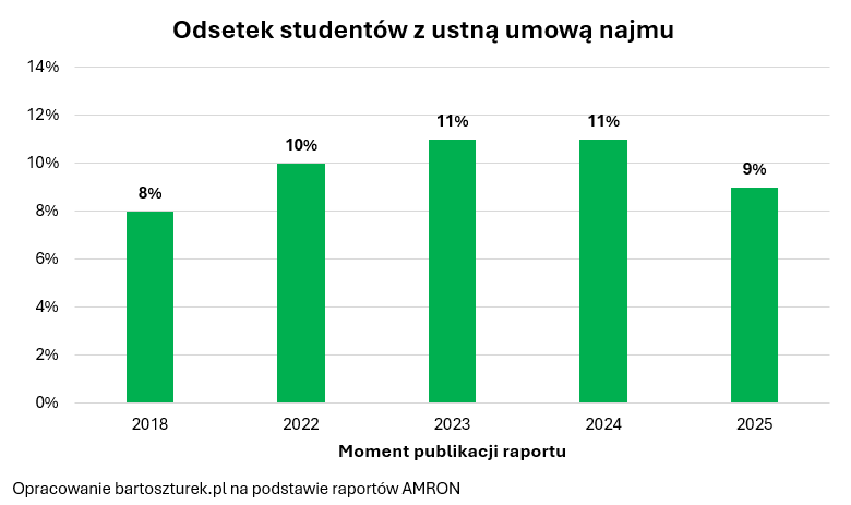 Warto więc spojrzeć na problem też z innej strony. Kuszącym sposobem na oszacowanie wielkości szarej strefy wynajmu jest też pojawiający się od lat raport przygotowywany przez AMRON dotyczący rynku najmu studenckiego. Z najnowszej jego edycji wynika, że 9% żaków nie ma spisanych z właścicielami umów, a polegają jedynie na ustnych ustaleniach. Istnieje tu podejrzenie, że to właśnie w tym miejscu mamy szarą strefę. Zakładając znowu, że nieruchomości na wynajem w 2023 roku było w Polsce około 1,5 miliona, a dziś może nawet trochę więcej, to znowu wielkość szarej strefy wynajmu oszacować można na około 100-150 tysięcy nieruchomości.