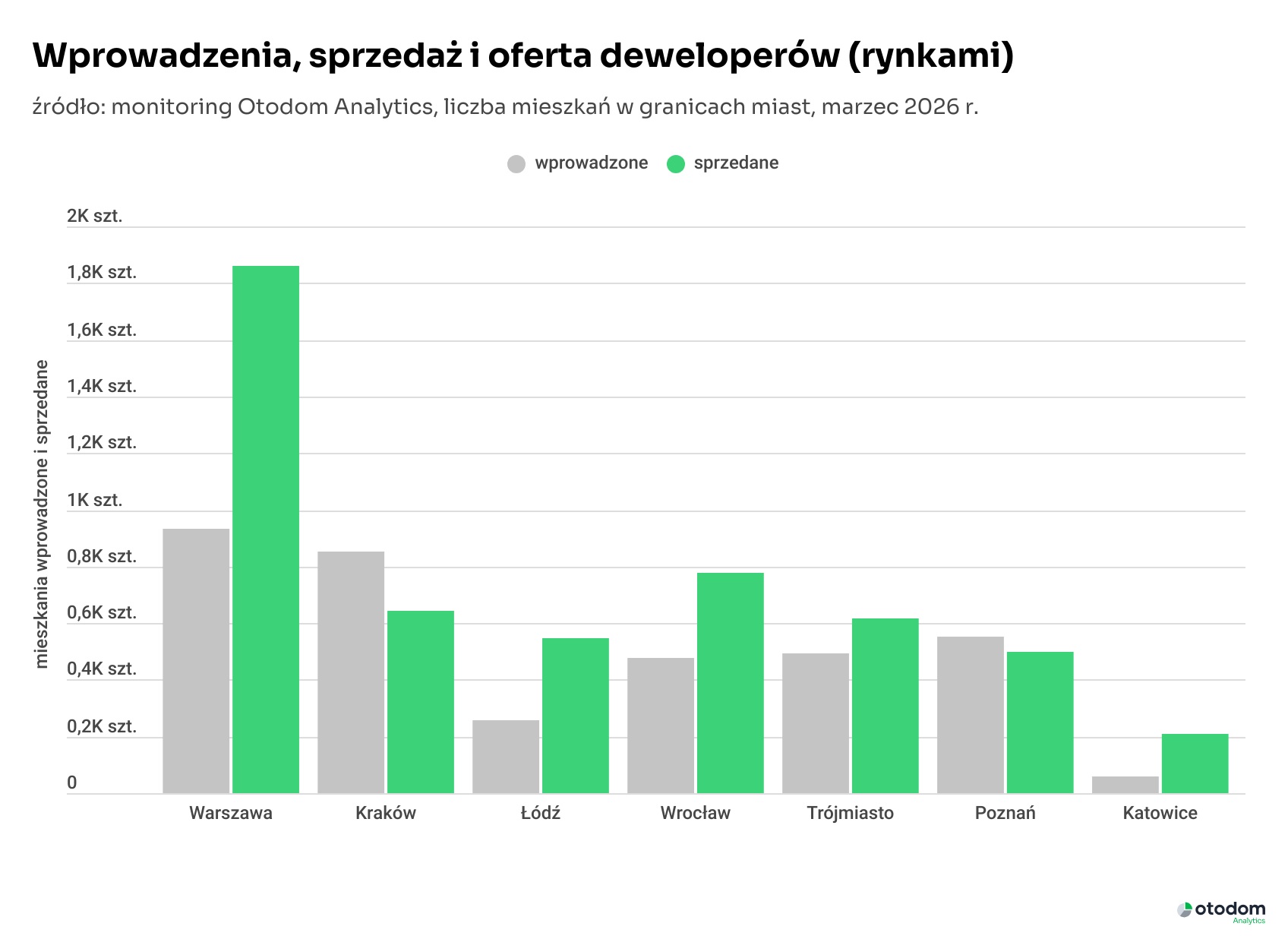 Relacja mieszkań wprowadzonych i sprzedanych w marcu na poszczególnych rynkach wskazuje, że obok miast z wyraźną przewagą popytu nad bieżącą podażą (Warszawa Łódź, Wrocław, Trójmiasto, Katowice) znalazły się również rynki z odwrotną tendencją (Kraków, Poznań).