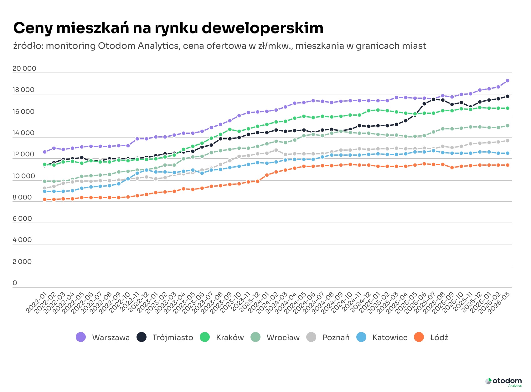 – Przede wszystkim już w marcu wojna na Bliskim Wschodzie wywołała jednoznacznie negatywne skutki makroekonomiczne w otoczeniu polskiego rynku mieszkaniowego. Inflacja CPI i Wibor 6M – dwa najbardziej istotne czynniki wpływające na kształtowanie się popytu na kredyty mieszkaniowe, wzrosły w stosunku do lutego. Mimo to, sprzedaż mieszkań deweloperskich na siedmiu największych rynkach w Polsce (Katowice, Kraków, Łódź, Poznań, Trójmiasto, Warszawa, Wrocław) sięgnęła w marcu 5,1 tys. i była o 19% wyższa od porównywalnych, wstępnych wyników z lutego i o 40% od wyników wstępnych z marca 2025 roku – wyjaśnia dyrektorka badań rynku Otodom.