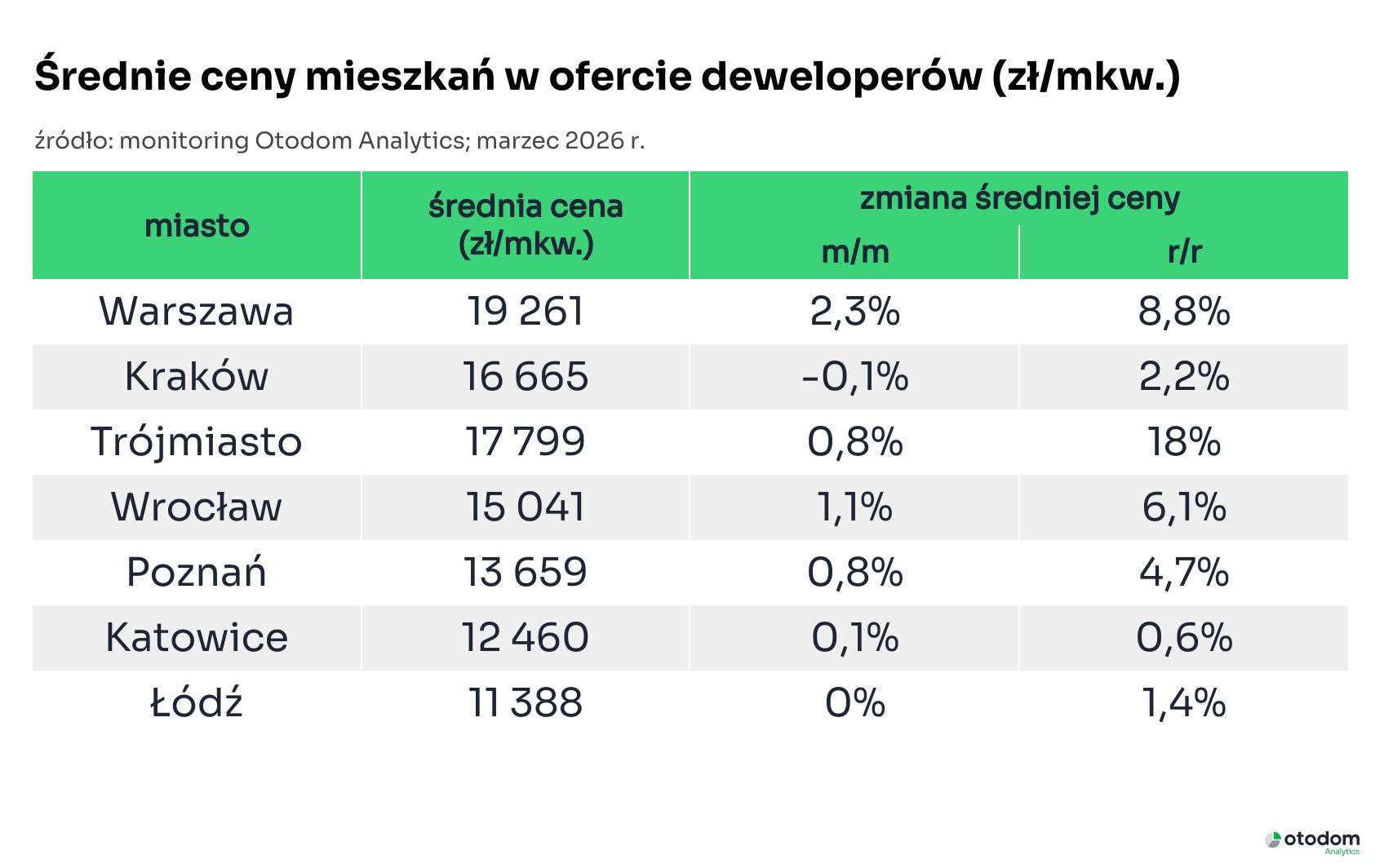 Choć marzec przyniósł negatywne skutki makroekonomiczne związane z wojną na Bliskim Wschodzie, rynek mieszkań deweloperskich zanotował niespodziewane ożywienie po stronie popytowej. Według wstępnego odczytu sprzedaż w siedmiu największych miastach wzrosła o 19% względem lutego, a w Warszawie, Trójmieście, Wrocławiu i Poznaniu średnie ceny ofertowe poszły w górę.