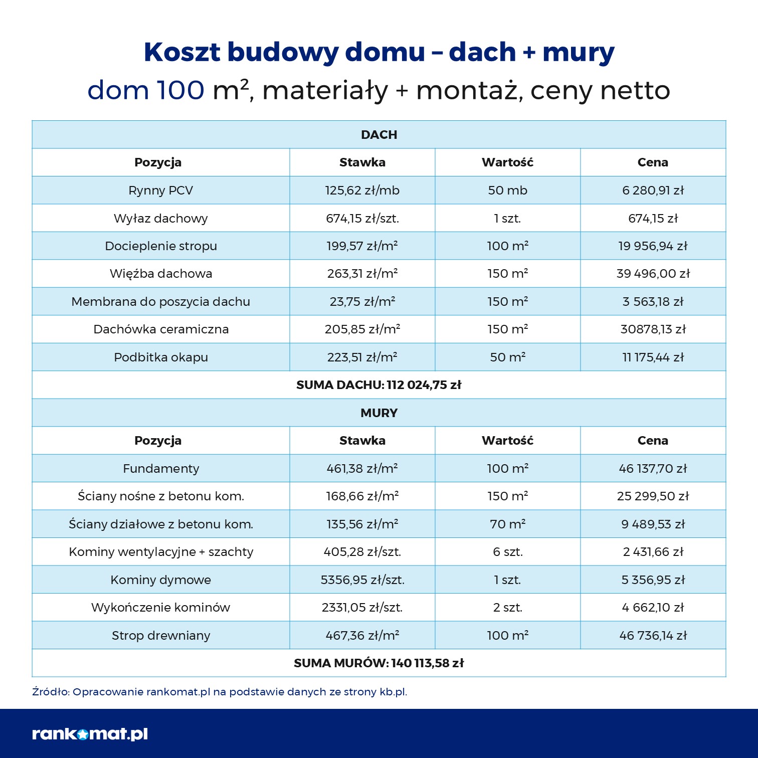 Przy budżecie 441 tys. zł: 32% kosztów stanowi wzniesienie murów, 25% – wykonanie dachu, 7% – stolarka, 36% – doprowadzenie budynku do stanu deweloperskiego (instalacje, tynki, posadzki). Tak wynika z danych kb.pl. Materiały budowlane odpowiadają zazwyczaj za 60–70% całej inwestycji.