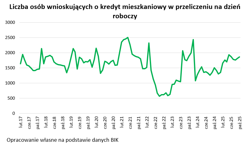 Zgodnie z przewidywaniami październik znowu przyniósł bardzo dobre informacje na temat liczby osób, które zawnioskowały o kredyt hipoteczny. Dane BIK sugerują, że na taki krok zdecydowały się prawie 43 tysiące osób. Tak wysoki wynik zawdzięczamy dwóm czynnikom. Po pierwsze pomógł kalendarz. W październiku oddziały banków otwarte były bowiem przez 23 dni. Do tego ze względu na stabilne ceny mieszkań, rosnące wynagrodzenia i spadające oprocentowanie sukcesywnie rośnie zainteresowanie kredytami. W październiku wnioski kredytowe składało po 1866 osób w przeliczeniu na dzień roboczy. To o prawie 3% więcej niż przed miesiącem i prawie o 1/4 więcej niż rok wcześniej.