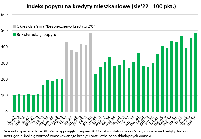 Co więcej, przeciętny wniosek opiewał na prawie 475 tysięcy złotych. W efekcie indeks popytu na kredyty jest już nawet wyższy niż u szczytu popularności „Bezpiecznego Kredytu 2%”.