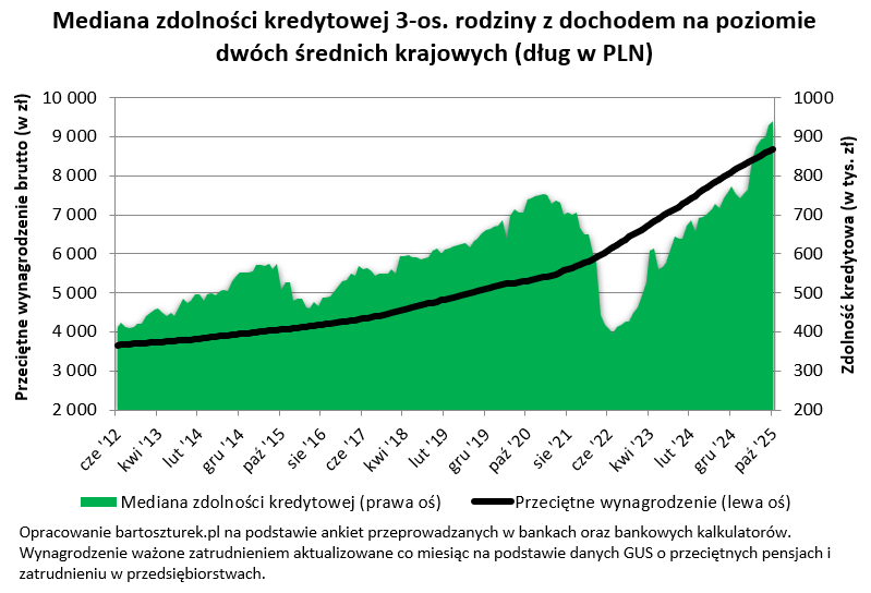 Nie powinno jednak ulegać wątpliwości, że stabilne ceny mieszkań, rosnące wynagrodzenia i taniejące kredyty, to otoczenie, na które potencjalni nabywcy mieszkań musieli długo czekać. Ciekawym wskaźnikiem obrazującym to jak dostępne są kredyty mieszkaniowe jest deklarowana przez banki zdolność kredytowa. W przypadku trzyosobowej rodziny z dochodem na poziomie dwóch średnich krajowych możemy już mówić o medianie zdolności kredytowej na poziomie około 940 tysięcy złotych. W ujęciu nominalnym jest to najwięcej w historii i o około 1/4 więcej niż w analogicznym okresie przed rokiem. Gdyby jednak urealnić ten wynik uwzględniając zmianę poziomu wynagrodzeń lub cen mieszkań, to do rekordów jeszcze daleko.