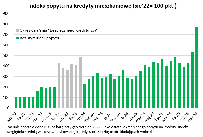 Wzrost liczby osób ubiegających się o kredyt w połączeniu z rekordem przeciętnej wnioskowanej kwoty doprowadził do sytuacji, w której popyt na kredyty mieszkaniowe był w marcu br. o ponad 80% wyższy niż rok temu – wynika z danych BIK. Skala popytu była więc najwyższa w historii pozostawiając daleko w tyle nawet popyt zgłaszany pod koniec działania najhojniejszego programu dopłat do kredytów, czyli „Bezpiecznego Kredytu 2%”.