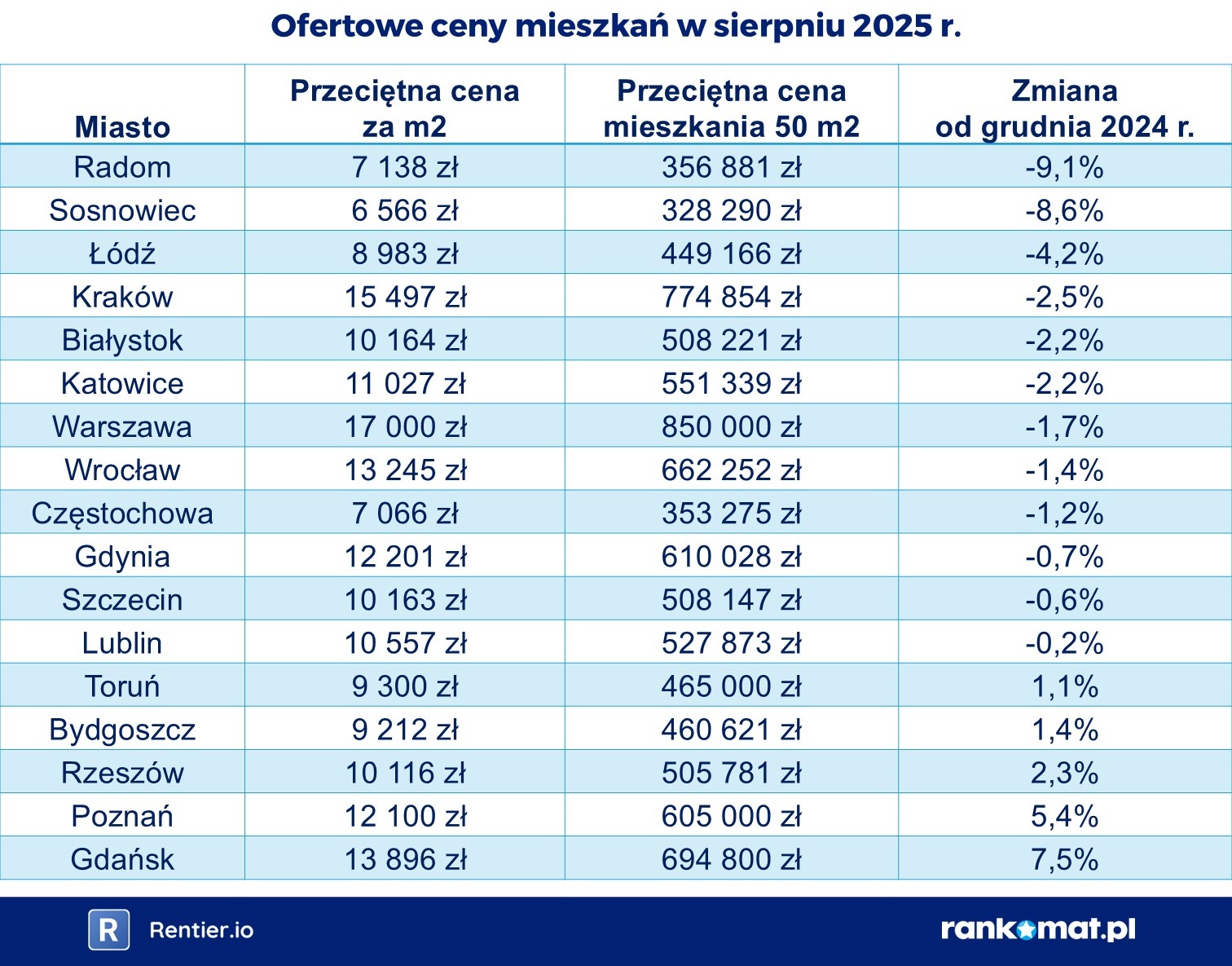 Sierpień, podobnie jak większość tego roku, był okresem, w którym ceny mieszkań pozostawały dość stabilne. Średnia zmiana, jaka dokonała się w ciągu ośmiu miesięcy 2025 r. w 17 badanych miastach, to spadek o 1%. Wyjątki, czyli miasta, w których zmiany były znaczące, to np. Radom (-9,1%) i Sosnowiec (-8,6%). Jeśli chodzi o wzrosty, pojawiły się w Gdańsku (+7,5%) oraz Poznaniu (+5,4%). W tym ostatnim odnotowaliśmy nowy rekord cenowy na poziomie 12 100 zł za m².
