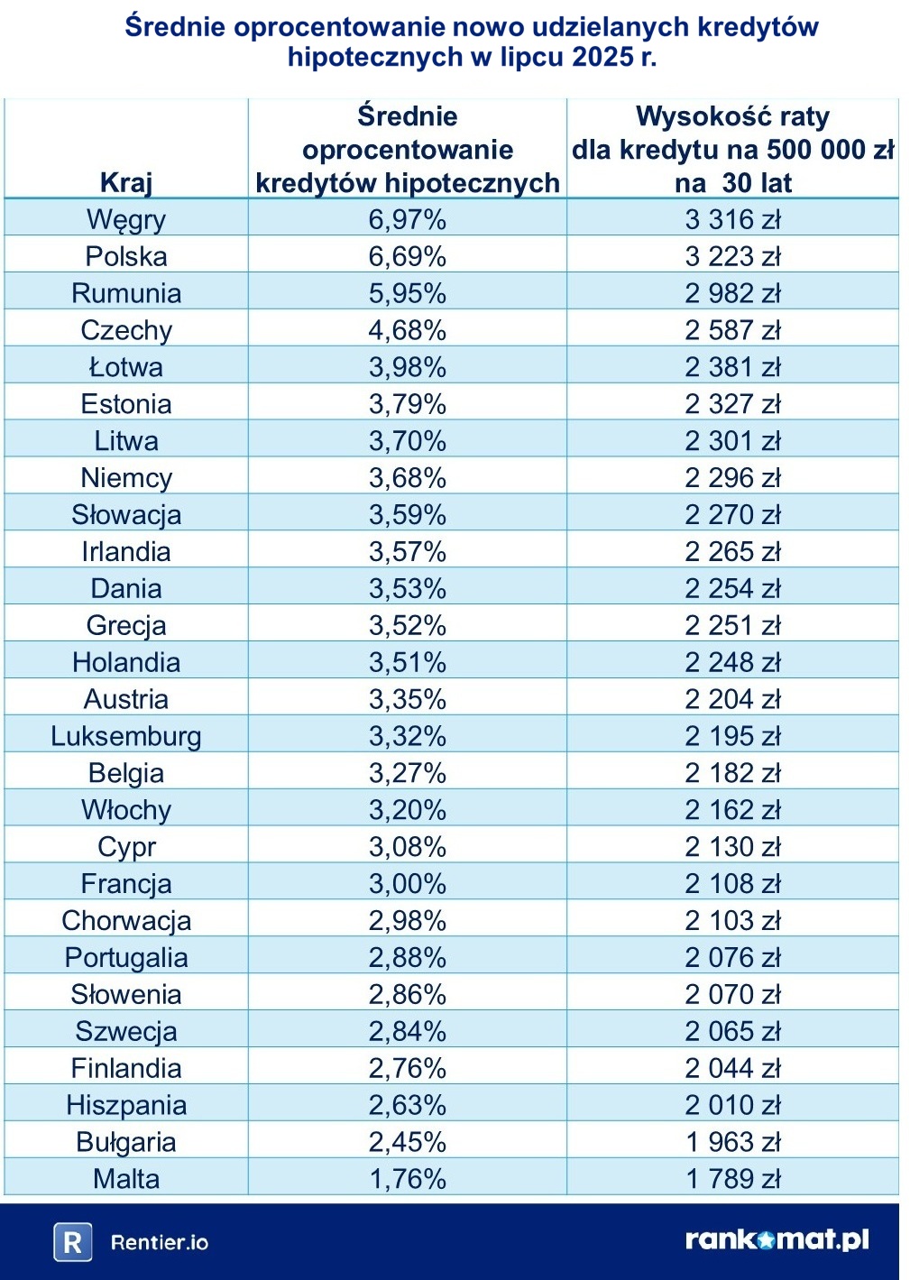 Przy oprocentowaniu takim, jakie mieliśmy w Polsce w lipcu (6,69%), rata kredytu na 500 tys. zł na 30 lat wynosi 3 223 zł. Gdybyśmy mieli takie oprocentowanie jak Czesi, rata wynosiłaby 2 584 zł. Przy oprocentowaniu jak w Niemczech byłoby to 2 2296 zł, a przy takim jak we Francji – 2 108 zł. Z kolei mając tak niskie oprocentowanie jak na Malcie, rata wynosiłaby 1 789 zł.