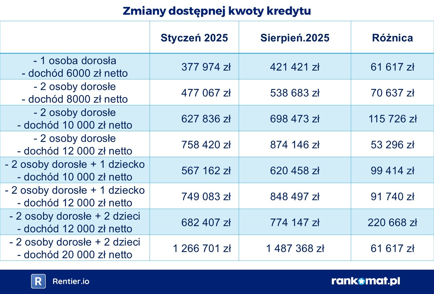 Z raportu Rankomat.pl i Rentier.io wynika, że zdolność kredytowa dla części kredytobiorców wzrosła od stycznia o ponad 200 tys. zł. Pomimo obniżek oprocentowanie nowo udzielanych kredytów hipotecznych wciąż jest drugim najwyższym w UE. U nas jest to 6,69%, a np. w Czechach 4,68%, we Francji 3%, a na Malcie zaledwie 1,76%. Gdybyśmy mieli takie oprocentowanie jak we Francji, rata kredytu na 500 tys. zł na 30 lat zamiast wynosić 3 223 zł, byłaby na poziomie 2 108 zł. Nasze oprocentowanie jest więc ponad dwukrotnie wyższe niż francuskich kredytów, a rata jest wyższa o 52%.