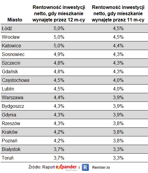 Po raz kolejny obliczyliśmy rentowność inwestycji w mieszkanie na wynajem, kupowane bez udziału kredytu. Zakładając zakup po cenach majowych oraz jego wynajem po stawkach z tego samego okresu, rentowność netto wynosi średnio 4,5% netto. To przy założeniu, że mieszkanie ma 50 m2 i jest wynajmowane przez pełne 12 miesięcy w roku. Wyliczenie uwzględnia wszystkie koszty, czyli prowizję pośrednika (3%), PCC (2%) przy założeniu, że kupujemy z rynku wtórnego, taksę notarialną i wypisy, odświeżenie po zakupie, meble, cykliczne nakłady na odświeżenie i drobne naprawy, ubezpieczenie nieruchomości, podatek ryczałtowy (8,5%) oraz zarządzanie najmem (10% od przychodu). Przy jednym miesiącu pustostanu, kiedy to czynsz do administracji nie jest ponoszony przez najemców i stanowi koszt dla wynajmującego, rentowność wynosi 4% netto. Opłacalność takiej inwestycji jest więc niemal identyczna jak przed miesiącem.