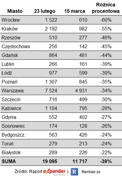 Sytuacja w poszczególnych miastach jest bardzo różna. W ujęciu procentowym największe zmiany zaszły we Wrocławiu (-60%), Krakowie (-55%) i Rzeszowie (-46%). Najmniejszy spadek miał miejsce w Białymstoku (-22%), Toruniu (-24%) i Bydgoszczy (-24%). Należy jednak dodać, że najmniejszy nie oznacza mały. Spadek liczby ogłoszeń o 22% czy 24% w mniej niż miesiąc również robi ogromne wrażenie.