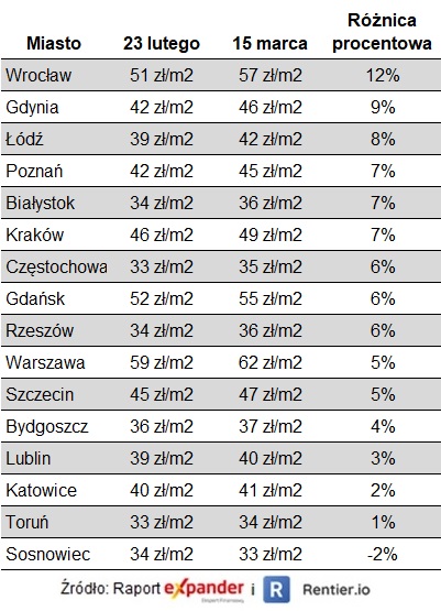 Tak ogromny wzrost popytu na najem sprawił, że zauważalnie podskoczył jego koszt. W ciągu mniej niż miesiąca we Wrocławiu średnia stawka podskoczyła aż o 12% (z 51 zł do 57 zł za m2). Na kolejnych miejscach pod tym względem znalazły się: Gdynia (+9%) i Łódź (+8%). Co ciekawe jest jednak jedno miasto, w którym w tym czasie stawki spadły. W Sosnowcu najem staniał o 2%.