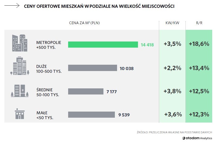 Co ciekawe, bez względu na wielkość miejscowości tempo wzrostu średnich stawek ofertowych było podobne. Oscylowało wokół 3,5-3,8% kw/kw. Wyjątek stanowiły jedynie duże miasta, liczące 100-500 mieszkańców (+2%) To potwierdza, że ubiegłoroczne wzrosty cen obserwowane dotychczas w największych i najbardziej popularnych lokalizacjach, rozlały się obecnie na mniejsze rynki.