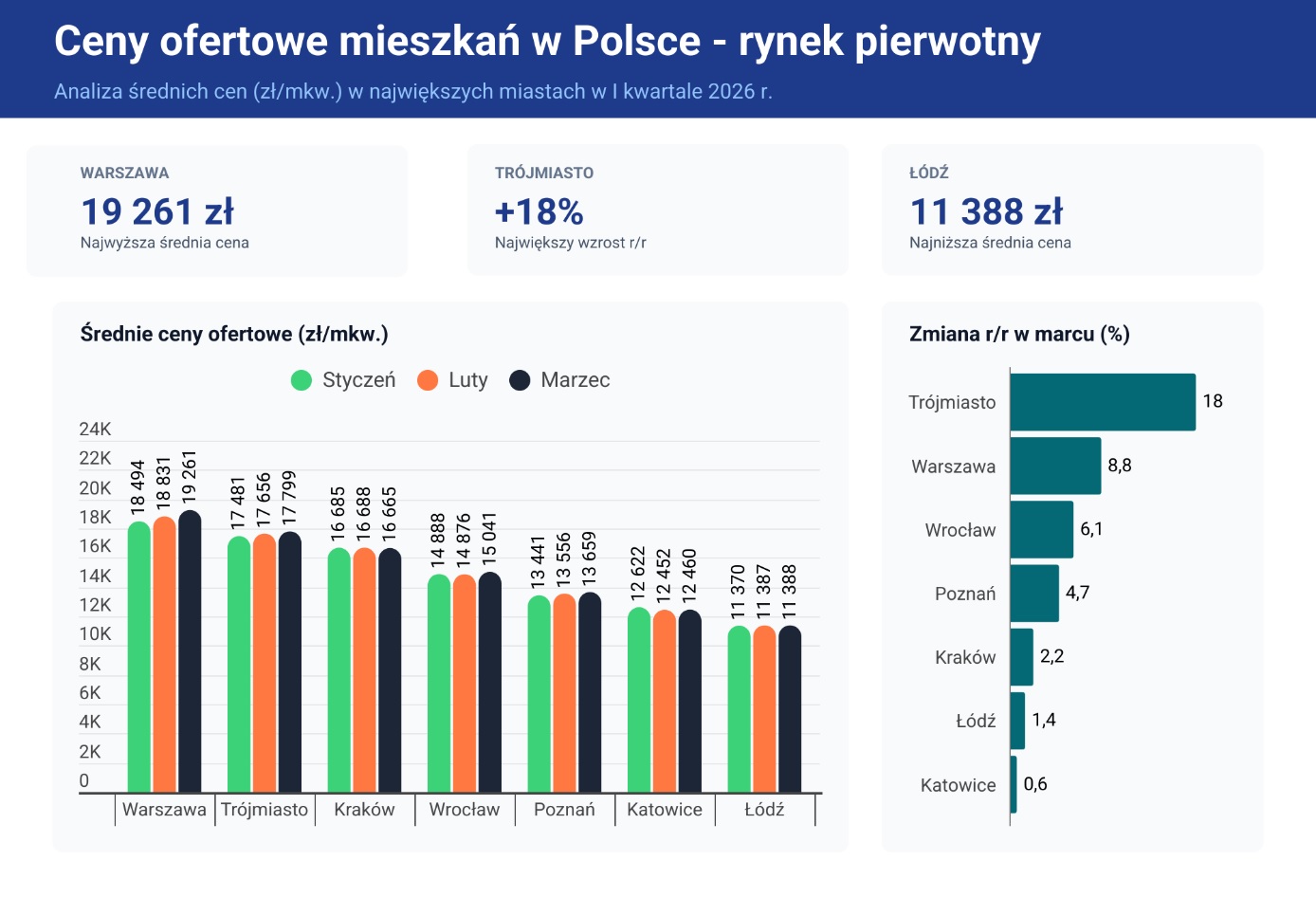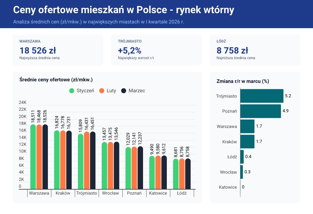 Zestawienie obu rynków pokazuje wyraźne różnice w dynamice cenowej. Według danych Otodom średnie stawki za mieszkania deweloperskie urosły w pierwszym kwartale o 1,6% w porównaniu z poprzednim kwartałem. Z kolei pod względem cen pierwszych trzech miesięcy ubiegłego roku wzrost ten osiągnął pułap 6,4%, co stanowiło wartość niemal dwukrotnie wyższą od bieżącej inflacji. Liderem wzrostów było Trójmiasto, gdzie ceny ofertowe z pierwszej ręki podskoczyły aż o 18% rok do roku.
