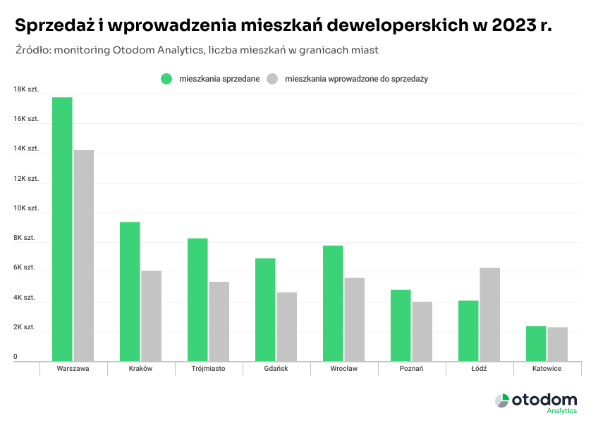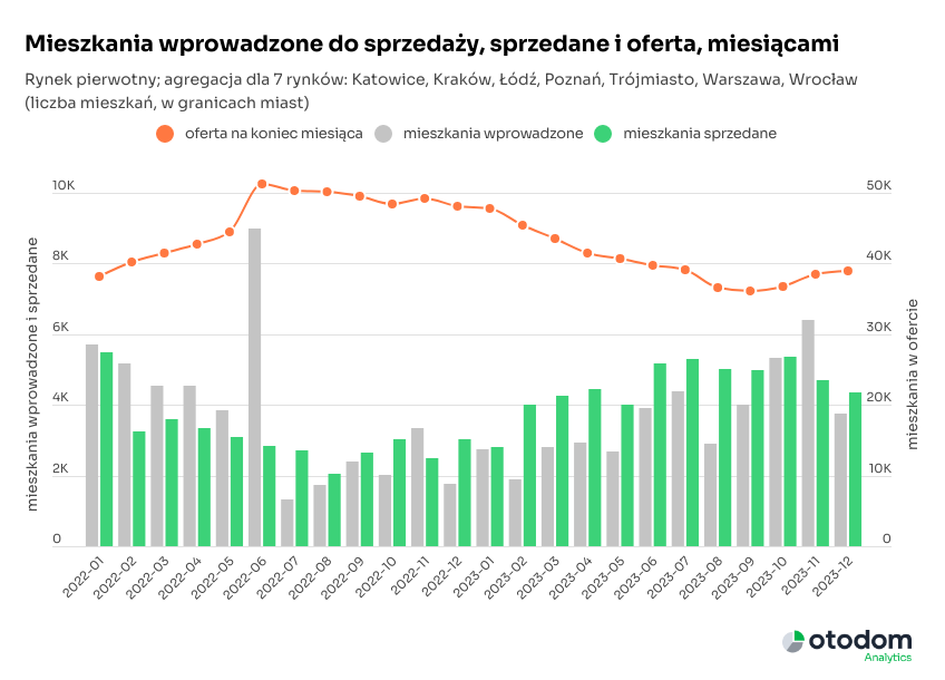 W całym roku w siedmiu miastach o największej skali rynku mieszkaniowego (Warszawa, Kraków, Wrocław, Gdańsk, Poznań, Łódź, Katowice) do sprzedaży trafiło 43,7 tys. mieszkań deweloperskich, o 4% mniej niż w 2022 r. W tym samym czasie sprzedano o 10,6 tys. lokali więcej, co sprawiło, że oferta spadła do poziomu 39 tys. łącznie na analizowanych przez Otodom rynkach, a to znaczy, że na koniec grudnia 2023 r. była o 19% niższa niż przed rokiem.