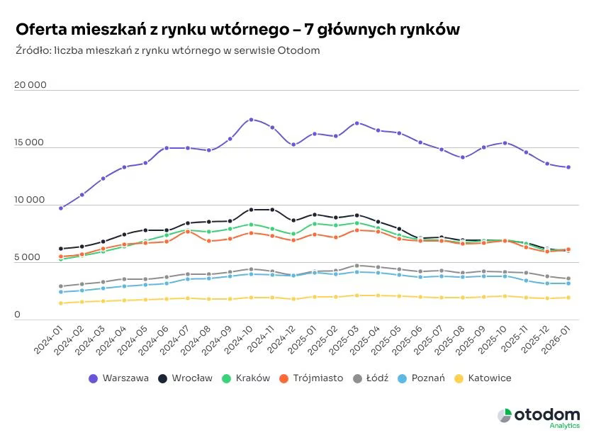 Styczeń 2026 roku potwierdził utrzymujący się układ sił na rynku mieszkaniowym, w którym rynek wtórny funkcjonuje przy coraz bardziej ograniczonej podaży, a deweloperski pozostaje relatywnie zasobny w lokale na sprzedaż. Z jednej strony, w ujęciu rocznym, popyt na mieszkania z drugiej ręki utrzymuje się na stabilnym poziomie (a w styczniu wyraźnie odbił po słabszym grudniu), z drugiej – oferta na rynku wtórnym skurczyła się w największych miastach aż o 22% rok do roku. W tym samym czasie rynek deweloperski notuje rekordową liczbę dostępnych lokali, co sprawia, że w wielu lokalizacjach zakup nowego mieszkania staje się nie tyle alternatywą, co koniecznością.