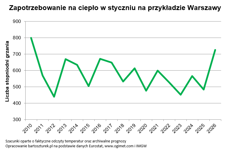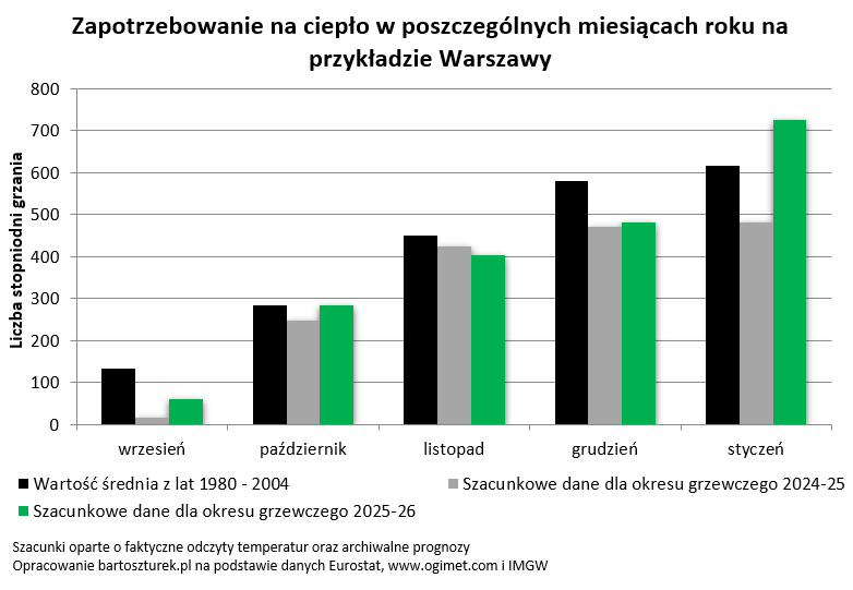 Korzystając z tej metodologii można obliczyć, że od początku września (tradycyjnie uważanego za początek okresu grzewczego) do końca stycznia 2026 r., łączna liczba stopniodni wyniosła w Warszawie około 1960. W poprzednim sezonie grzewczym było to około 1640 stopniodni. Ostatnie sezony grzewcze obchodziły się jednak z nami dość łagodnie. Warto więc przypomnieć, że w latach 1980-2004 w okresie od września do stycznia musielibyśmy standardowo mocniej niż w bieżącym sezonie grzewczym „dorzucić do pieca”. Przeciętne zapotrzebowanie na ciepło we wspomnianych latach było bowiem o kilka procent wyższe niż w bieżącym sezonie.
