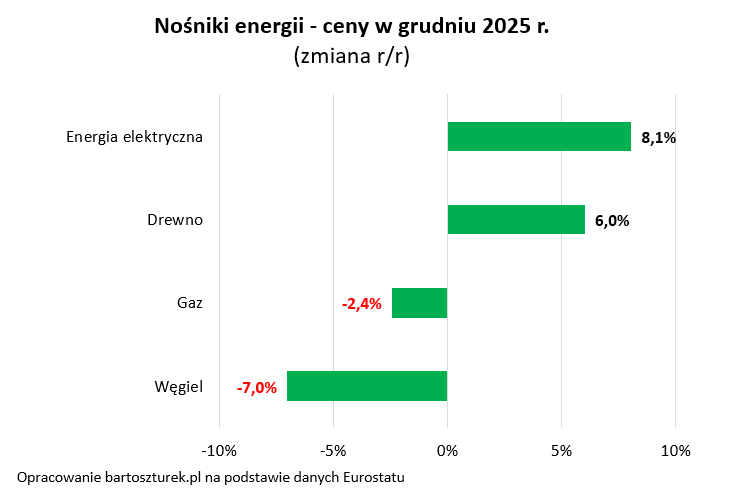 Nawet w przypadku węgla, którego ceny osiągały historyczne rekordy w 2022 roku koszt ogrzewania w styczniu 2026 roku mógł być najwyższy w historii. Zgodnie z danymi Eurostatu w grudniu 2025 roku węgiel był o 7% tańszy niż rok wcześniej oraz o 40% tańszy niż pod koniec 2022 roku. Jeśli jednak w styczniu trzeba było go wrzucić do pieca o ponad połowę więcej niż przed rokiem oraz o nawet ponad 60% więcej, niż na początku 2023 roku, to i tak atak zimy oznacza najwyższy styczniowy koszt ogrzewania w historii.