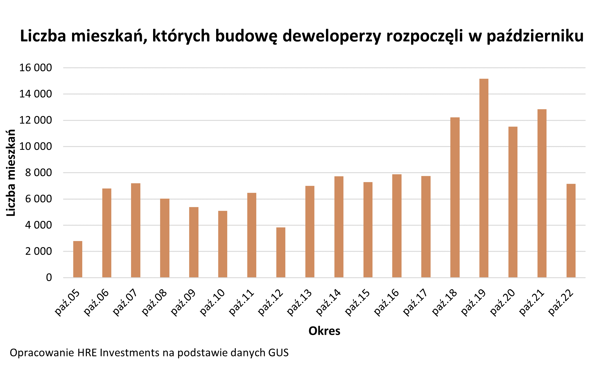 W październiku deweloperzy rozpoczęli budowę 7,1 tys. nowych mieszkań – wynika z najnowszych danych GUS. To o trochę ponad 44% mniej niż w analogicznym okresie przed rokiem. Jest to też najgorszy październikowy wynik od 2013 roku. Rezultat ten wpisuje się w dane płynące z rynku w ostatnim czasie. Warto przypomnieć, że każdy z poprzednich kwartałów bieżącego roku kończył się gorszymi niż przed rokiem danymi na temat liczby inwestycji rozpoczynanych przez deweloperów. Od stycznia do października deweloperzy zaczęli budować prawie 101 tys. nowych lokali. To o ponad 28% mniej niż w tym samym czasie 2021 roku.