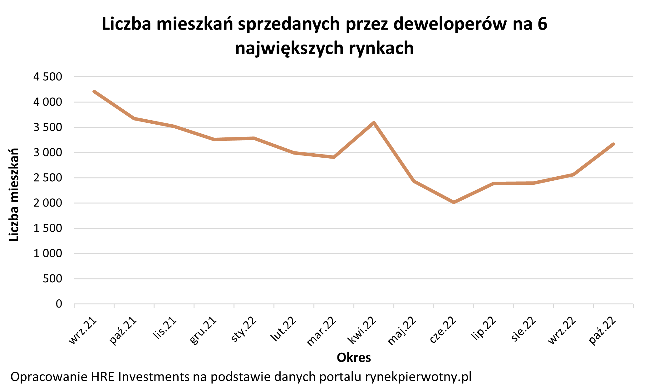 Jeśli ponadto wierzyć danym przedstawionym przez portal rynekpierwotny.pl, to w październiku deweloperzy sprzedali całkiem sporo mieszkań. Dane z 6 największych rynków (Warszawa, Wrocław, Kraków, Poznań , Gdańsk i Łódź) sugerują, że firmy budujące mieszkania znalazły nabywców na prawie 3,2 tys. lokali. To całkiem przyzwoity wynik. Co prawda jest to wciąż o około 10-15% mniej niż w analogicznym okresie przed rokiem, ale przecież rok 2021 był pod wieloma względami rokiem rekordowym. Ponadto licząc od czerwca, który w bieżącym roku był najgorszym pod względem wolumenu sprzedaży, liczba podpisanych umów była w październiku już o ponad połowę lepsza. Oczywiście jest jeszcze za wcześnie, aby mówić o poważnej zmianie rynkowej, ale przy odbudowującej się sprzedaży i pikującej liczbie rozpoczynanych inwestycji trzeba się liczyć z tym, że oferta w biurach sprzedaży deweloperów będzie coraz bardziej przebrana. Czas dopiero pokaże czy taki scenariusz nas czeka.