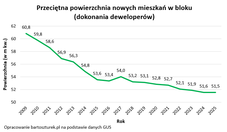 Jeszcze w 2009 roku przeciętne nowe mieszkanie w bloku wybudowanym przez dewelopera miało ponad 60 m kw. Teraz jest to już o ponad 9 metrów mniej. Najnowsze dane GUS pozwalają bowiem oszacować, że w 2025 roku przeciętne mieszkanie oddane do użytkowania przez dewelopera miało 51,5 m kw. To najniższy wynik na przestrzeni ostatnich 17 lat, dla których urząd udostępnia stosowne dane.