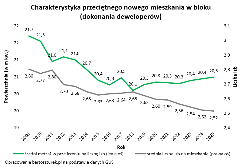 Dane sugerują, że trend ten nie tylko zatrzymał się, ale nawet odwrócił i to kilka lat temu. Problem w tym, że przeciętne nowe „M” ma mniej pokoi – tak jak i, niestety, przeciętne gospodarstwo domowe liczy coraz mniej osób.