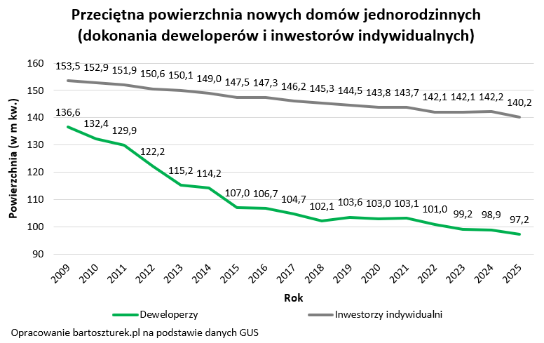 Efekt jest taki, że przeciętny dom jednorodzinny zbudowany przez Polaków na własne potrzeby był w 2025 roku o prawie połowę większy (44%) niż ten, który dostarczyli deweloperzy. Inwestorzy indywidualni wciąż budują przeciętnie trochę ponad 140 m kw. I choć 16 lat temu również na własne potrzeby budowaliśmy większe domy, to tylko o kilkanaście metrów większe niż obecnie.
