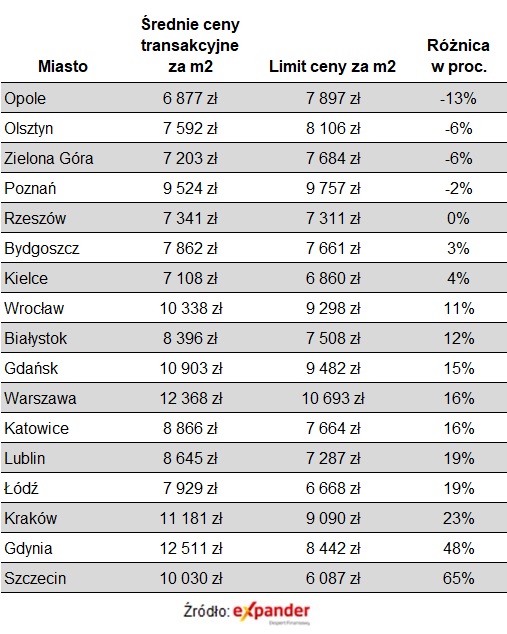 W tym ostatnim mieście również nastąpił spory wzrost limitu (o 9%), ale mniejszy niż w pozostałej części województwa (o 12%) . Z punktu widzenia potencjalnych uczestników programu kluczowe jest jednak to, jak nowy limit wygląda na tle cen obowiązujących w danym regionie. Z wyliczeń Expandera wynika, że w przypadku rynku pierwotnego najłatwiej znaleźć mieszkanie w odpowiedniej cenie w Opolu, Olsztynie, Zielonej Górze, i Poznaniu. Mamy jednak również złe informacje. Okazało się, że nie da się uzyskać preferencyjnego kredytu na zakup spółdzielczego własnościowego prawa do lokalu, co ma ogromne znaczenie dla mieszkań z rynku wtórnego.