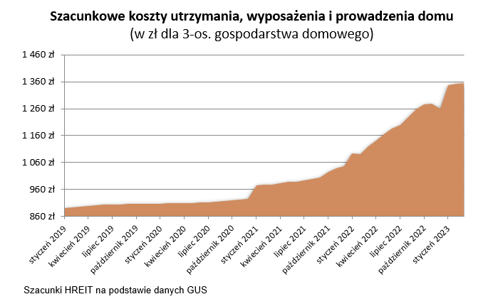 Marzec przyniósł kolejne podwyżki kosztu utrzymania, prowadzenia i wyposażenia mieszkania. Statystyczna rodzina na ten cel wydaje już około 1356 złotych miesięcznie – wynika z szacunków HREIT opartych o dane GUS. W ciągu roku wydatki te poszły w górę o ponad 21%, co odpowiada podwyżce o niemal 240 złotych.