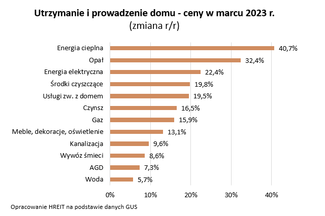 Nie zmienia to jednak faktu, że wciąż na liście dóbr i usług składających się na koszty utrzymania i prowadzenia domu, dominują te, które w ostatnim roku drożały z dwucyfrową dynamiką. Oprócz opału w tej grupie znajdziemy też energię cieplną (o ponad 40% droższą niż rok temu), energię elektryczną (wzrost o 22% r/r), a także środki czyszczące, usługi związane z domem, czynsz, gaz i wyposażenie. Niestety w danych GUS próżno szukać kategorii, składającej się na koszty utrzymania i prowadzenia domu, które pokazywałyby, że coś w ostatnim roku staniało.