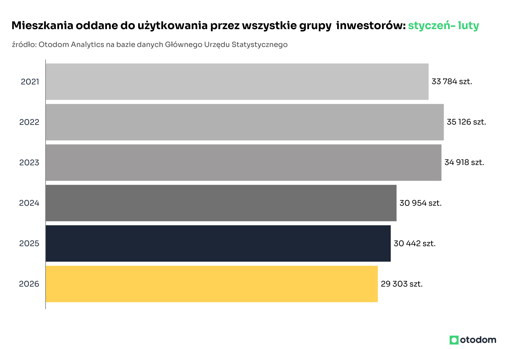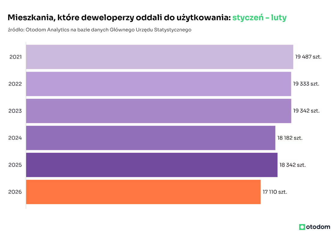 Z danych GUS wynika, że liczba mieszkań i domów oddanych do użytku w Polsce w lutym była porównywalna zarówno z wynikami ze stycznia, jak również z lutym 2025 roku. Wszystkie grupy inwestorów oddały łącznie 14,6 tys. lokali, czyli o 0,3% mniej niż w styczniu i o 0,9% więcej niż rok wcześniej. W ramach tej puli deweloperzy dostarczyli 8,5 tys. mieszkań, co oznacza spadek o 1,3% miesiąc do miesiąca i o 1,4% w ujęciu rocznym. Mimo że różnice względem poprzedniego miesiąca i roku są niewielkie, to warto zaznaczyć, że liczba mieszkań oddanych w dwóch pierwszych miesiącach 2026 roku jest najniższa od pięciu lat zarówno w kategorii budownictwa ogółem, jak również w segmencie deweloperskim (na sprzedaż lub wynajem).