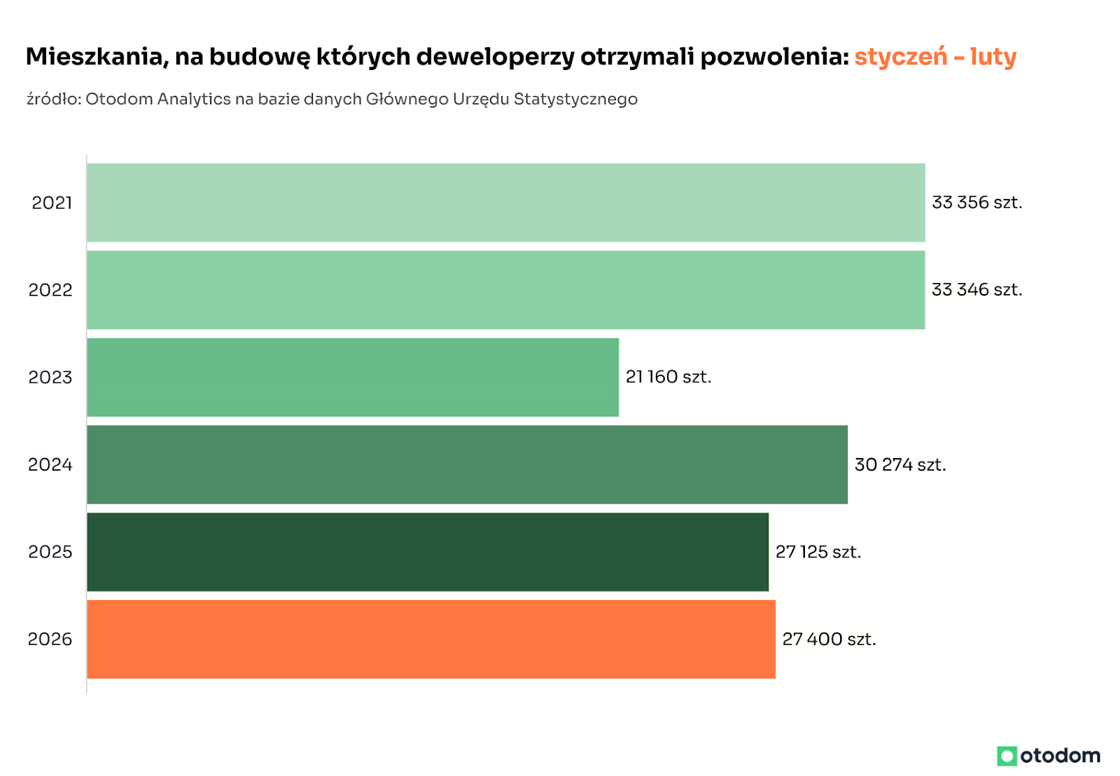 W pierwszych dwóch miesiącach 2026 roku deweloperzy uzyskali pozwolenia na budowę łącznie 27,4 tys. mieszkań i domów (o 1% więcej r/r), a inwestorzy indywidualni 12,3 tys. (o 10,6% więcej r/r).