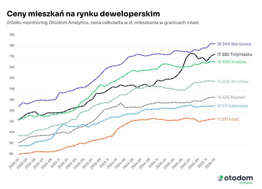Łódzki rynek deweloperski w ostatnich miesiącach wykazuje oznaki stabilizacji, pomimo wyzwań związanych z wysoką ofertą mieszkań. W Łodzi wyraźnie skrócił się czas wyprzedaży oferty nowych lokali. Dzięki dobrej sprzedaży w ostatnich trzech miesiącach 2025 roku czas potrzebny na wyprzedaż dostępnych mieszkań spadł w styczniu br. do sześciu kwartałów. Warto zauważyć, że jest to poziom, który ostatni raz notowano w pierwszym kwartale 2024 r., co świadczy o poprawie dynamiki sprzedaży. Z pewnością przyczynił się do tego dobry sprzedażowo grudzień z licznymi promocjami i akcjami specjalnymi kierowanymi przez deweloperów do potencjalnych nabywców.
