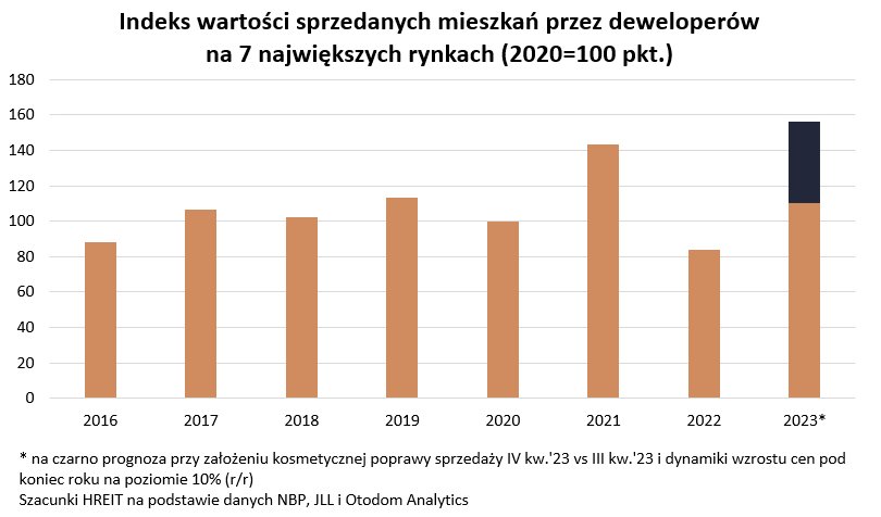 Przewaga popytu nad podażą każe jednak sądzić, że w ostatnim kwartale br. mieszkania zdrożały. Gdyby zachowawczo założyć, że ów wzrost cen to 10% w porównaniu do analogicznego okresu przed rokiem, to rok 2023 będzie rekordowy pod względem wartości sprzedanych mieszkań. W porównaniu do 2022 roku niewiele brakuje nam do podwojenia wartości sprzedanych mieszkań, a dotychczasowy rekord z 2021 roku możemy pobić o około 5-10% – wynika ze wstępnych szacunków HREIT.