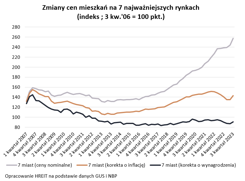 Zaskakujący jest za to wynik ostatnich 12 miesięcy. Sugeruje on bowiem, że chociaż dynamika inflacji nam spada, a wzrost cen mieszkań przyspiesza, to dotychczas dostępne dane wciąż świadczą o realnym spadku cen mieszkań. To znaczy, że przeciętne ceny dóbr i usług konsumpcyjnych rosły w ostatnim czasie szybciej niż ceny mieszkań. Spójrzmy na konkretne liczby. Według wstępnych danych NBP za 3 kwartał ceny mieszkań na 7 największych rynkach wzrosły bowiem w ciągu roku o 8,3%. Dla porównania szacowana przez GUS inflacja w analogicznym okresie to 9,7%, a średnia dla całego 2023 roku ma wg projekcji analityków NBP wynieść 11,4%.