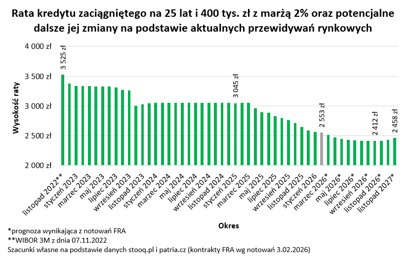 Najlepiej pokazać to na konkretnym przykładzie. Weźmy pod uwagę ratę 25-letniego kredytu mieszkaniowego zaciągniętego na kwotę 400 tysięcy złotych. Tę na początku 2025 roku można było szacować na 3045 złotych miesięcznie. Dziś może to być o około 490 złotych mniej (około 2550). Jeśli ponadto sprawdzą się przewidywania wynikające z notowań kontraktów terminowych na stopę procentową, to w bieżącym roku wspomniana rata spaść może jeszcze o około 5-6% czyli około 130-140 złotych. Przy tym oczywiście musimy mieć świadomość, że wspomniane notowania rynkowe potrafią bardzo dynamicznie zmieniać się pod wpływem napływających informacji. Dlatego podchodząc roztropnie do zarządzania domowym budżetem, należy przygotowywać się również na realizację mniej optymistycznych scenariuszy.