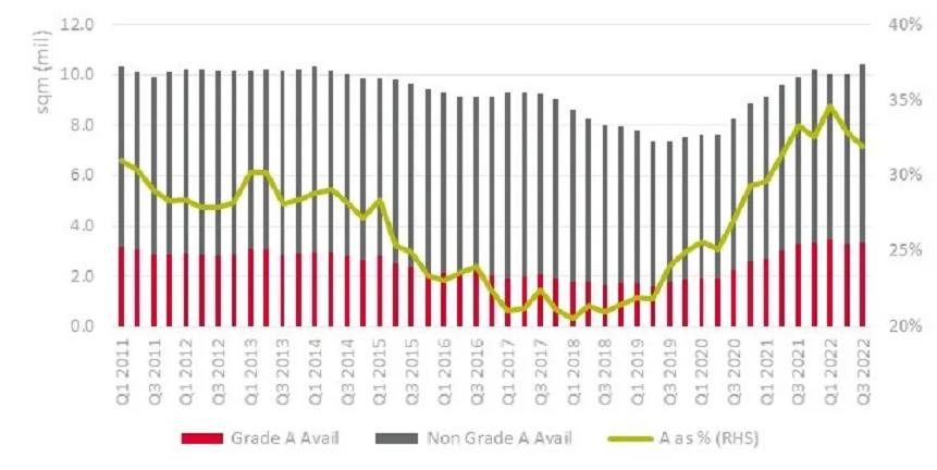 W rezultacie udział procentowy powierzchni biurowej klasy A w całkowitej ilości dostępnej powierzchni biurowej w Europie zmniejszył się w ostatnich dwóch kwartałach z 35% do 32%. To nadal stosunkowo dużo według standardów historycznych, ale kilka czynników, w tym zainteresowanie budynkami o wyższej jakości oraz spowolnienie aktywności deweloperskiej, będzie powodować presję zniżkową na dostępność powierzchni klasy A – zarówno w stosunku do całkowitych zasobów, jak i ilości dostępnej powierzchni.