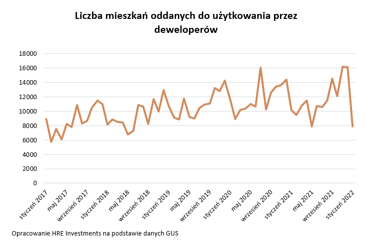 Najczęściej komentowane są dane GUS na temat liczby mieszkań oddanych do użytkowania. W tym przypadku deweloperzy nie mieli się w styczniu czym pochwalić. W pierwszym miesiącu 2022 roku oddali bowiem do użytkowania tylko 7905 mieszkań i to w skali całego kraju. Oznacza to spadek o 51% względem grudnia i prawie o ¼ gorszy wynik niż w styczniu 2021 roku.