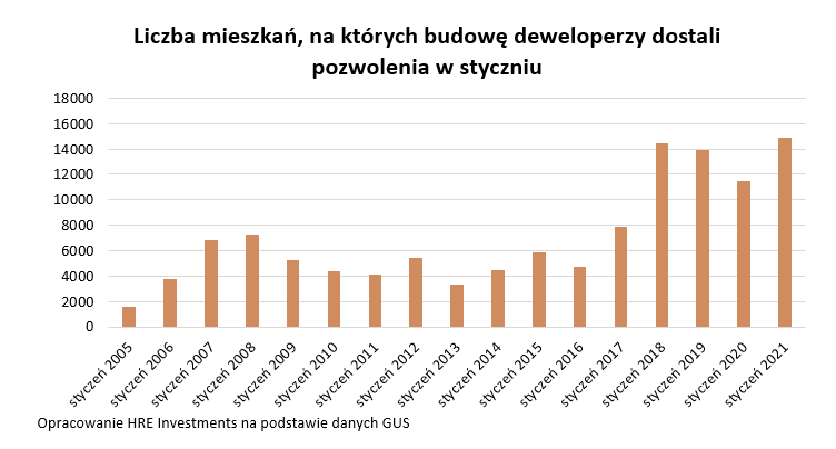 Na drugim biegunie mamy dane na temat pozwoleń na budowę. Z tego obszaru płyną do nas liczby napawające optymizmem. Okazuje się bowiem, że pierwszy miesiąc 2022 roku był dla deweloperów najlepszym styczniem w historii. Firmy budujące mieszkania dostały bowiem pozwolenia na wzniesienie kolejnych 15,6 tysięcy mieszkań. To o prawie 5% więcej niż w analogicznym okresie przed rokiem.