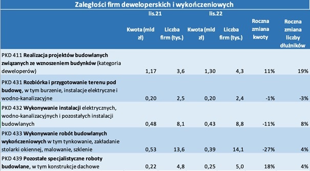 – Pogłębienie problemów dotyczy firm budowlanych działających w branży: Realizacja projektów budowlanych związanych ze wznoszeniem budynków (PKD 41). A szczególnie grupy, w której mieszczą się deweloperzy (PKD 41.10), w której rok do roku obserwujemy 19-proc. wzrost liczby niesolidnych płatników do 4,3 tys. i 11-proc. wzrost opóźnionych zobowiązań, do 1,3 mld zł.