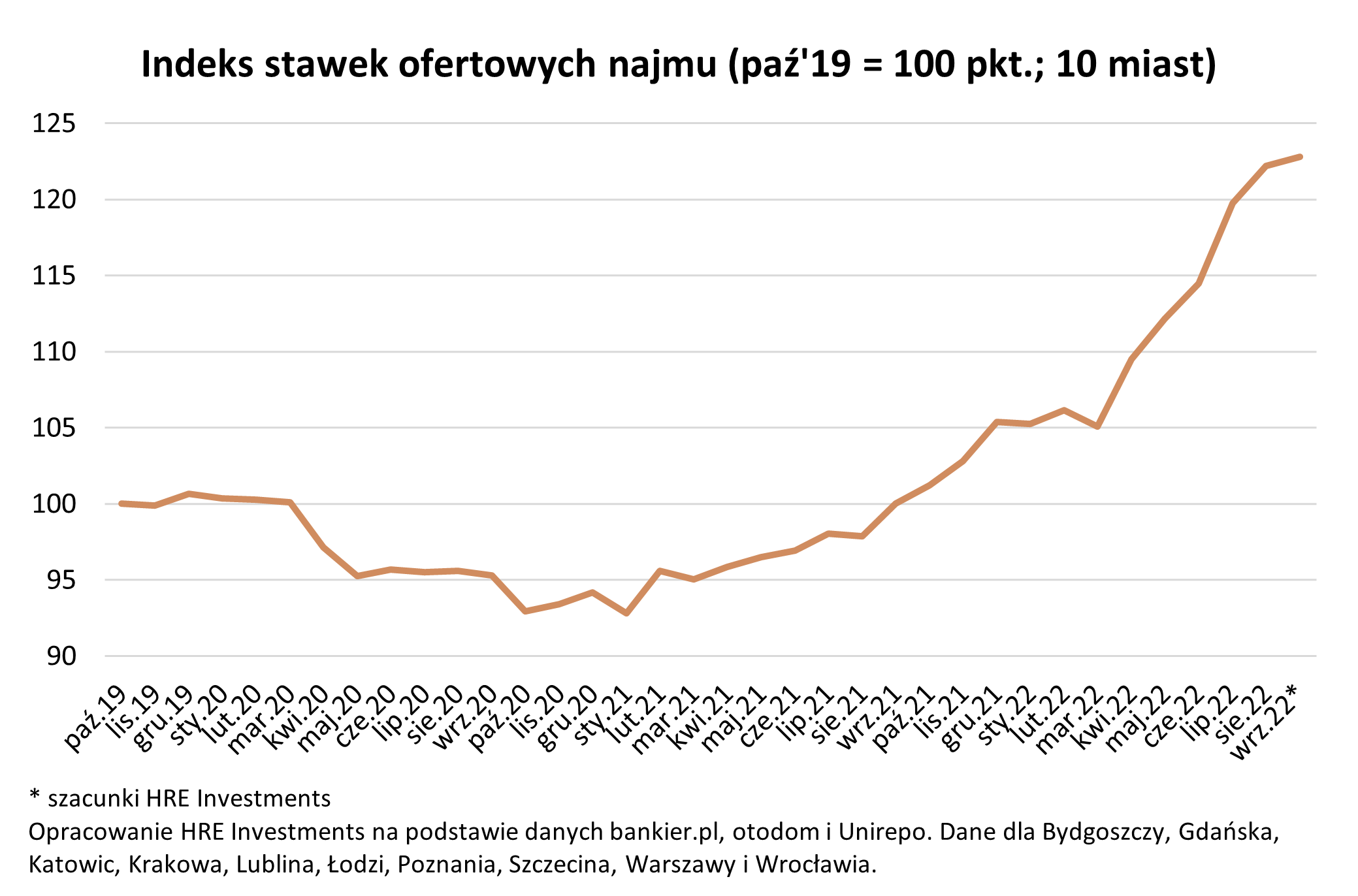 Niska liczba wolnych mieszkań na wynajem to oczywiście pokłosie utrzymującej się od miesięcy przewagi popytu nad podażą. Jest to sytuacja sprzyjająca wzrostowi stawek czynszów. Te w największych miastach są dziś o około 1/4 wyższe niż przed rokiem. Podwyżki czynszów wynikają nie tylko z ruchów migracyjnych, ale też wzmożonej inflacji i podwyżek stóp procentowych (czego koszty właściciele chcą przynajmniej w części przerzucać na najemców). Do tego dochodzi fakt, że trudniejszy dostęp do kredytów zmusza też część osób, którym banki odmówiły „hipoteki”, do korzystania z mieszkań na wynajem. Podobna sytuacja może jeszcze trwać przez jakiś czas.